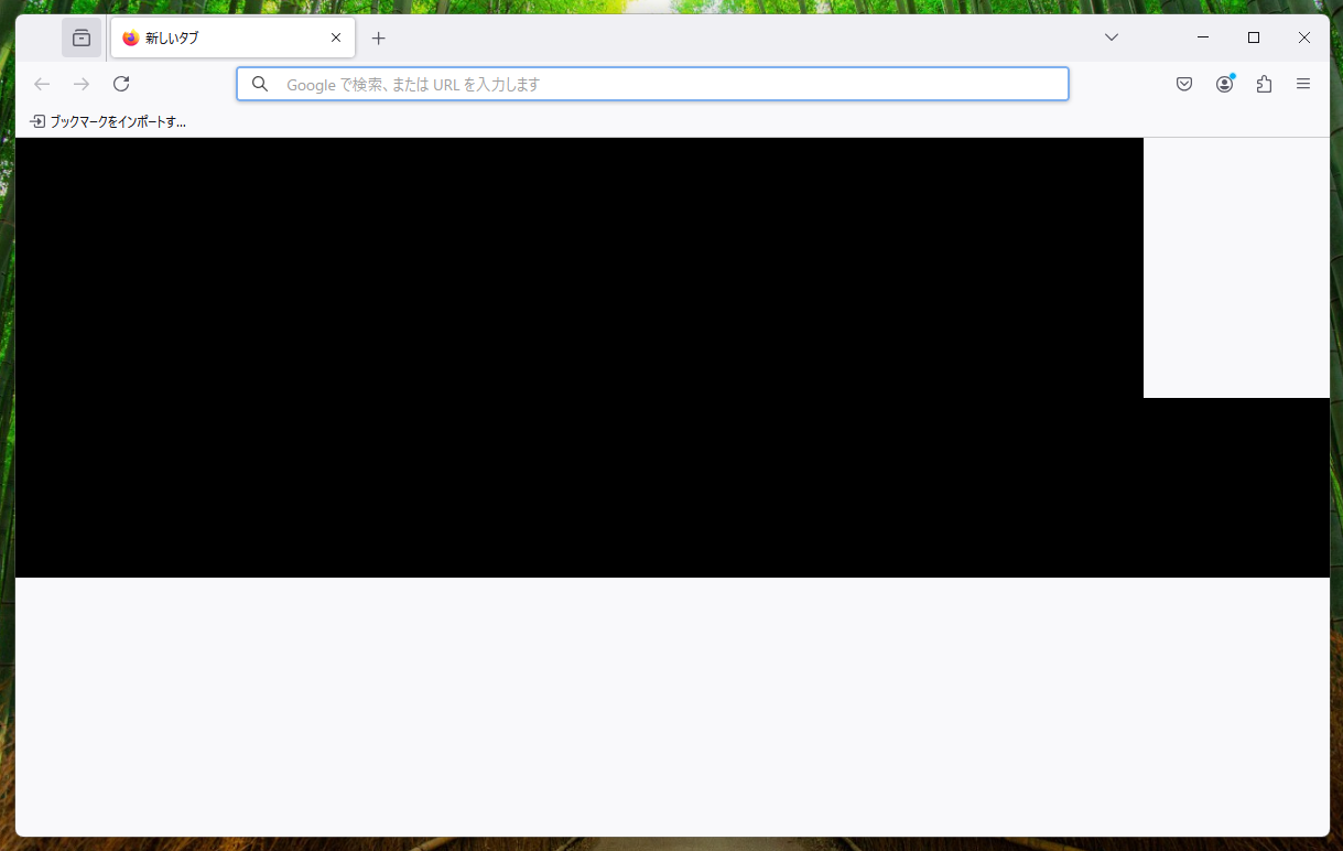 この状況では、殆ど使い物になりません。メニューなどは動作しますが、設定ページも表示されず厳しい感じです。FireFoxのクリーンアップや再インストール、ディスプレイドライバの再インストールを実施しても状況は改善しませんでした(FireFox以外のソフトは正常に動作します)