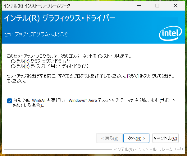 その後Intelサイトからダウンロードしたディスプレイドライバをインストールしてください。