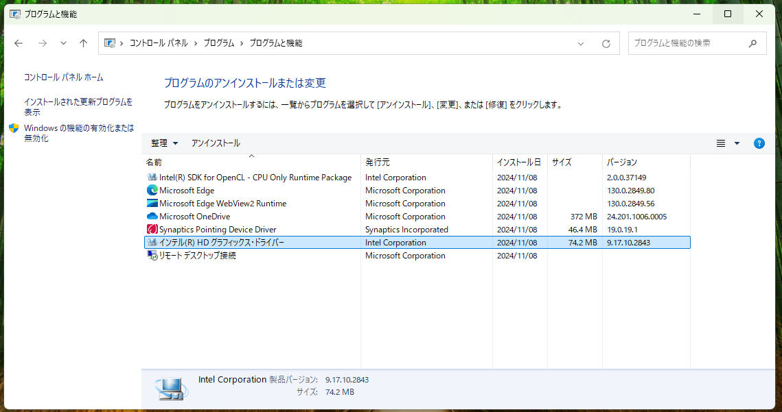 2.「インテル(R)グラフィックス・ドライバー」をダブルクリックし、アンインストールします。