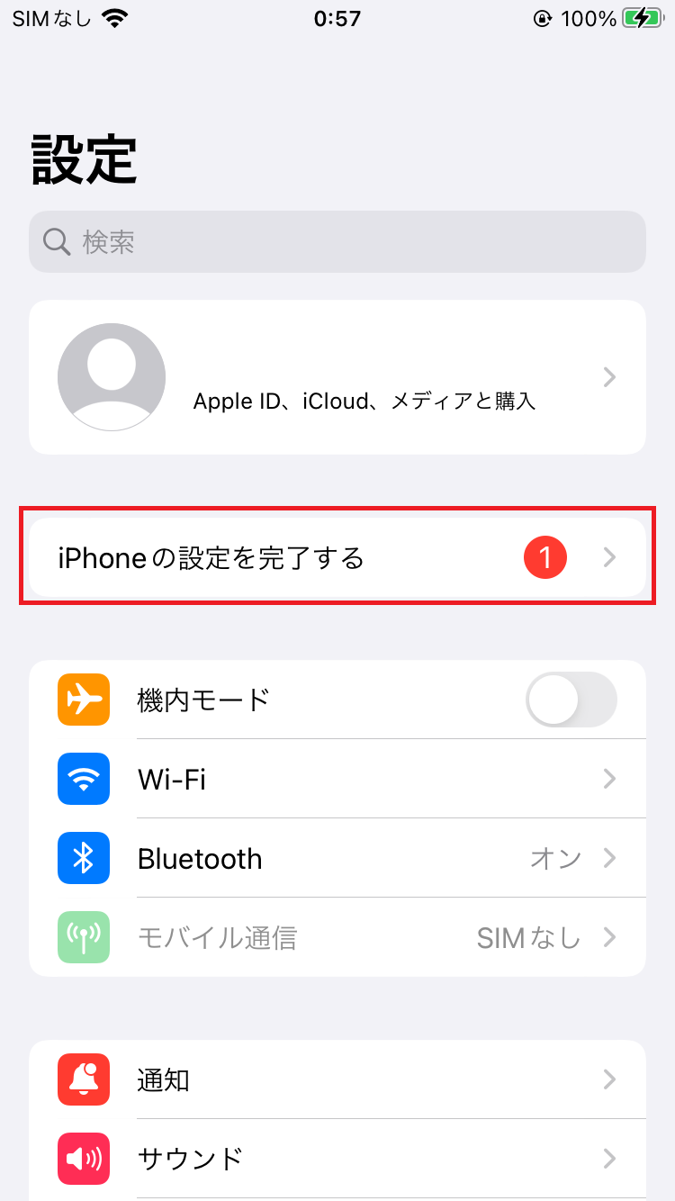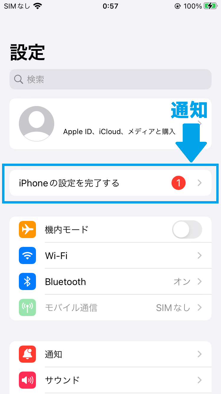 ①設定アプリに表示されている「iPhone の設定を完了する」の通知をタップします。